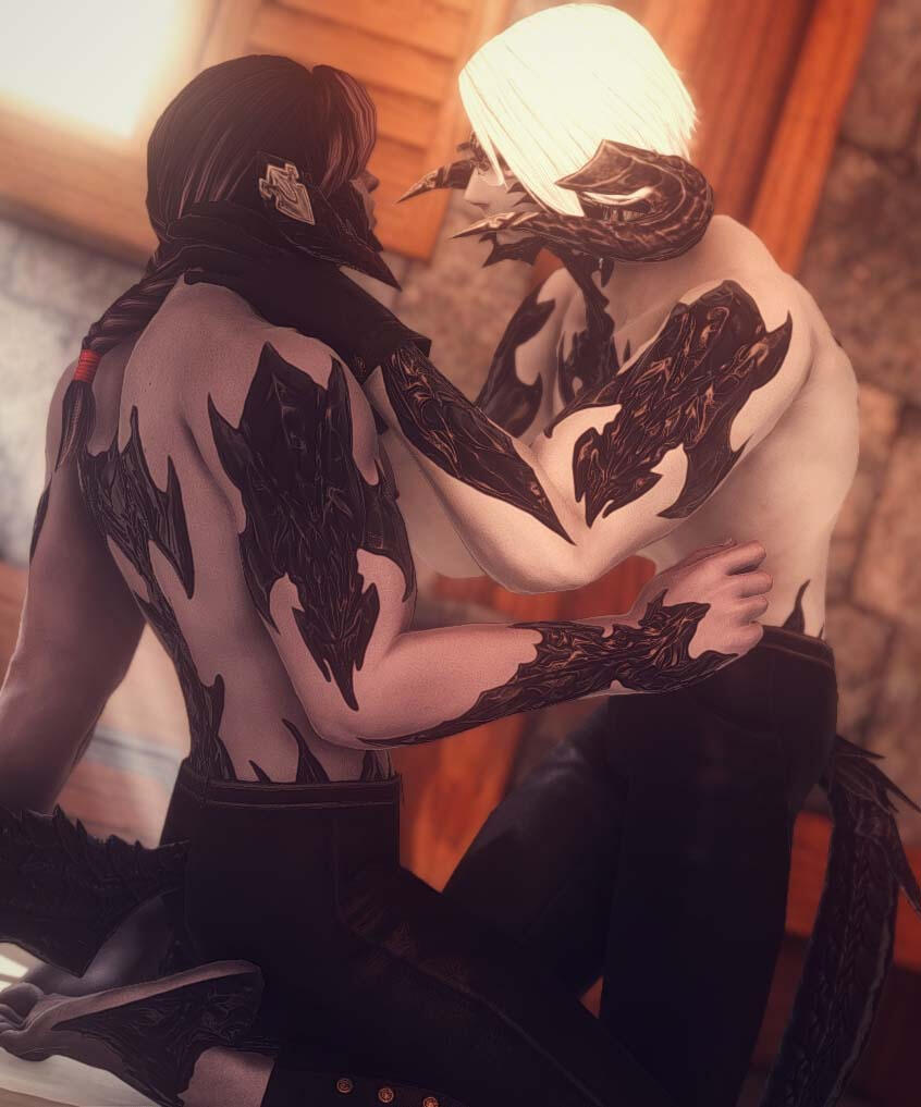 After arriving to Limsa Lominsa on a research trip, Shiluhn quickly learns from his contacts at the Arcanist's Guild of a recent accident caused by former member and aetherologist Arik Avagnir. A younger, somewhat hotheaded, yet bright individual who caused a massive, deadly explosion under the dubious pretense of research. According to the guild, he was found dead, yet no one he asked could inform him of any detail other than the inability to locate a body. Disintegrated, they'd said. Blown up. Destroyed. Like everything he touched. However, Shiluhn wasn't convinced their rouge researcher was dead, and made plans to stay in La Noscea for an extended period of time due to special circumstance. He quietly found a place to stay outside of the city, and began his search for Arik Avagnir, obsessively hunting down every bit of information he could find on his location. Normally, he wouldn't be so concerned with the affairs of others, especially one of this nature, but Arik was an Avagnar and his morbid curiosity about someone of his nature - stupid enough to parade around with that name, yet brilliant enough to cause ripples in the guild - was enough to drive his search.It doesn't take long to identify his home. Or, rather, his sister's. But for weeks, it seemed, Arik never once ventured out, even with all the evidence pointing towards his being alive. However, on one fateful day, he heads towards one of the smaller libraries on the outskirts of the city, and sees what has to be the man he's been looking for. Braided hair, slightly curved horns, dark scales, and brilliant blue eyes. Different. He'd been told they were yellow.Shiluhn approaches him, smiles, and introduces himself. A fellow researcher. Someone interested in his work. Someone who wanted to help. But he had to do much less than expected - soon enough, a simple invite to dinner led to bringing him home to drinking and kissing and pinning Arik to his bed and using him till he cried. He wanted it. They wanted it.Come back, he'd told him. He wanted to help his condition. He's a healer. He'll help him bear with his possession, his pain. And Arik, with a relieved smile, said he would. Shiluhn quickly learned two things: Arik had no bearing on his own history, and he was alone. A rough relationship with his sister led to Arik showing up at his house more often than not, and promises of treatment and aid were soon replaced by a feverish desire for physical comfort. But Shiluhn toed the line - pushed Arik to do what he wanted, nudged him to trust him inherently, slipped him doses of medication that served more as an aphrodisiac than a remedy. Time passed, and only after two years of their delicate, dangerous back-and-forth did Arik erupt and fight back. What had once been gentle coercion turned violent, and Shiluhn couldn't bend Arik to his will as before. And, after one vicious, painful argument, Arik stormed out and left for good.